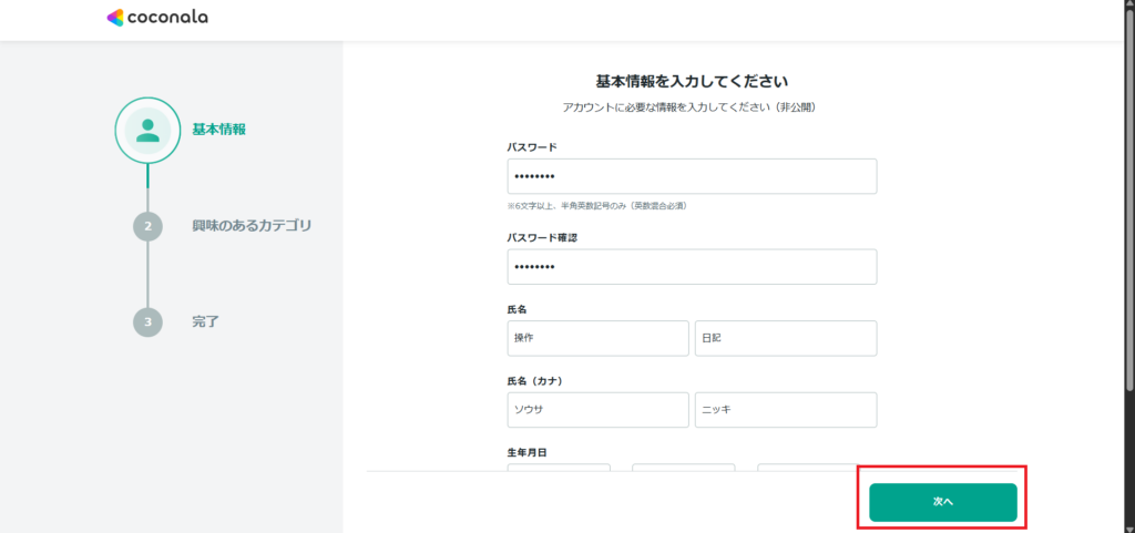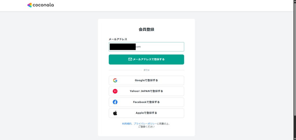 ココナラの登録は、メールアドレスとパスワードだけでOK。