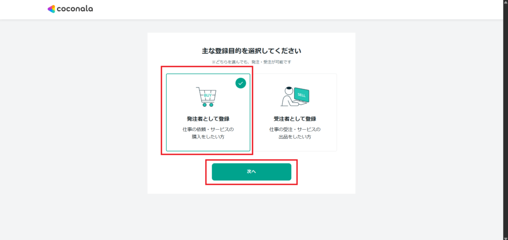 「発注者として登録」を選択して「次へ」をクリック