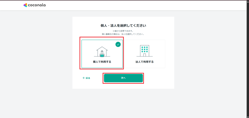「個人で利用する」を選択して「次へ」をクリック