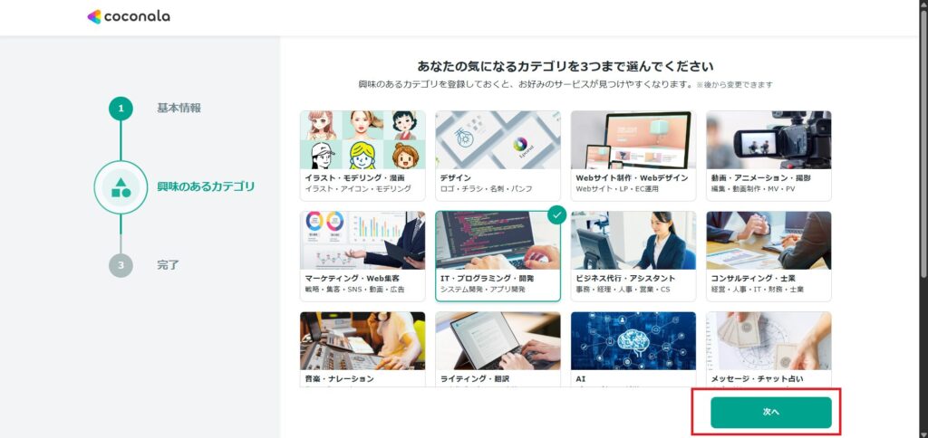気になるジャンルを選択し「次へ」をクリック