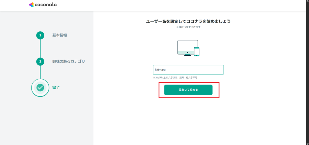 ニックネームを入力して「設定して始める」をクリック